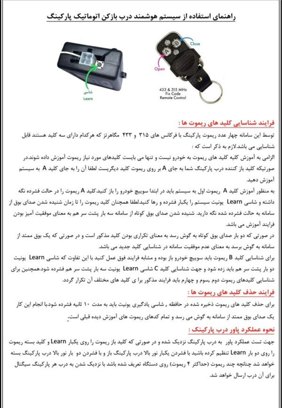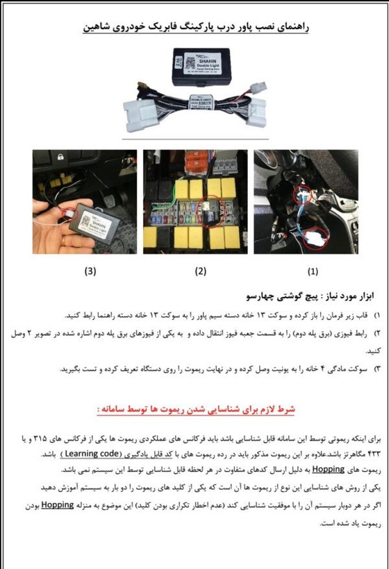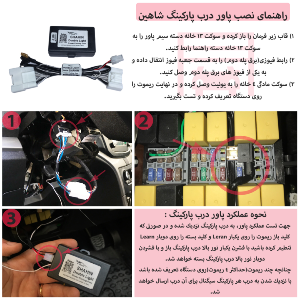 پاور درب پارکینگ یکی از آپشن های مفید و کارآمد جهت کنترل درهای پارکینگ بدون نیاز به ریموت آن می باشد. این سیستم بدون هیچگونه خدشه ای در درخت سیم خودرو و براحتی نصب شده و پس از یک بار آموزش ریموت پارکینگ خود، بدون نیاز به آن و تنها با استفاده از کلید نور بالا ( سلام ) قادر به باز و بسته نمودن درهای مختلف پارکینگ خواهید بود. این سیستم توانایی آموزش ۴ ریموت مختلف و هر یک با سه کلید فعال را خواهد داشت و قابلیت شناسایی کلیه ریموتهای پارکینگ (فیکس کد) را در فرکانسهای سری ۳۱۵ و ۴۳۳ مگاهرتز را فراهم میکند. این سیستم با قابلیت نصب فابریک جهت خودروی شاهین قابل استفاده می باشد.